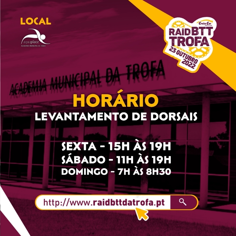 Horário de Levantamento de Dorsais •6.ª feira - 21/10/2022 das 15h até às 19h •Sábado - 22/10/2022 das 11h até às 19h •Domingo (dia da prova) das 7h até às 8h30 Local: Aquaplace - Academia Municipal da Trofa